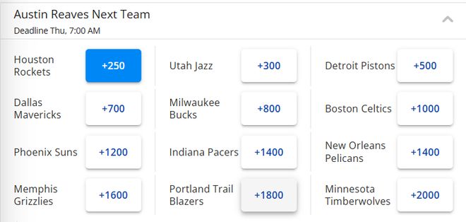 但如果里夫斯和湖人没有谈妥,最终离开这支球队呢?最新下家赔率显示,火箭(+250)已经成为他的头号热门下家,排在火箭后面的还有爵士、活塞、独行侠、雄鹿、凯尔特人等队。